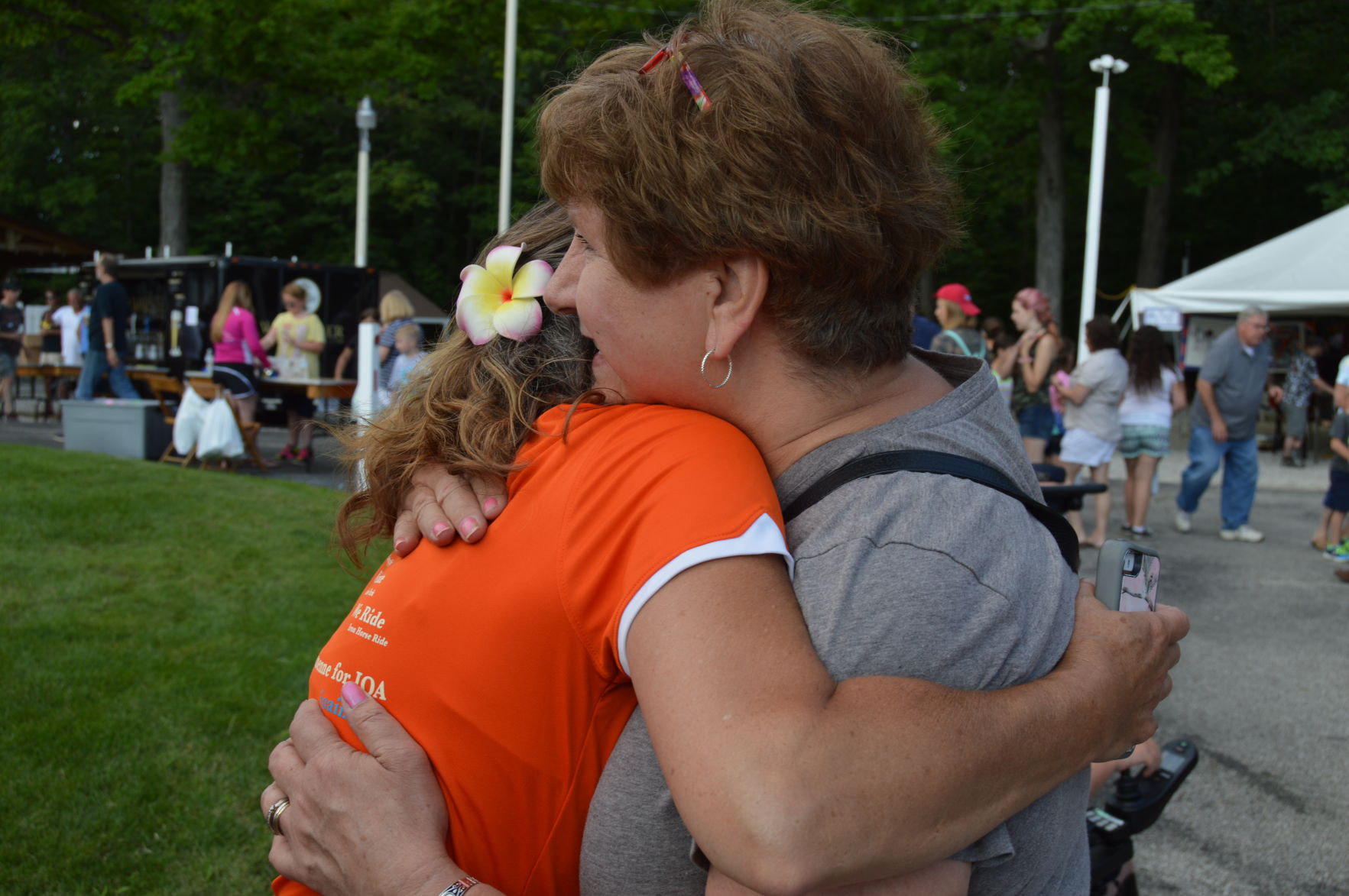 John Owen Dumm’s Cleveland Clinic nurse, Marge Zabukovec, (right) gives Jen Dumm a big hug. She called it a privilege to work with this family. Photo by JAIME ANTON