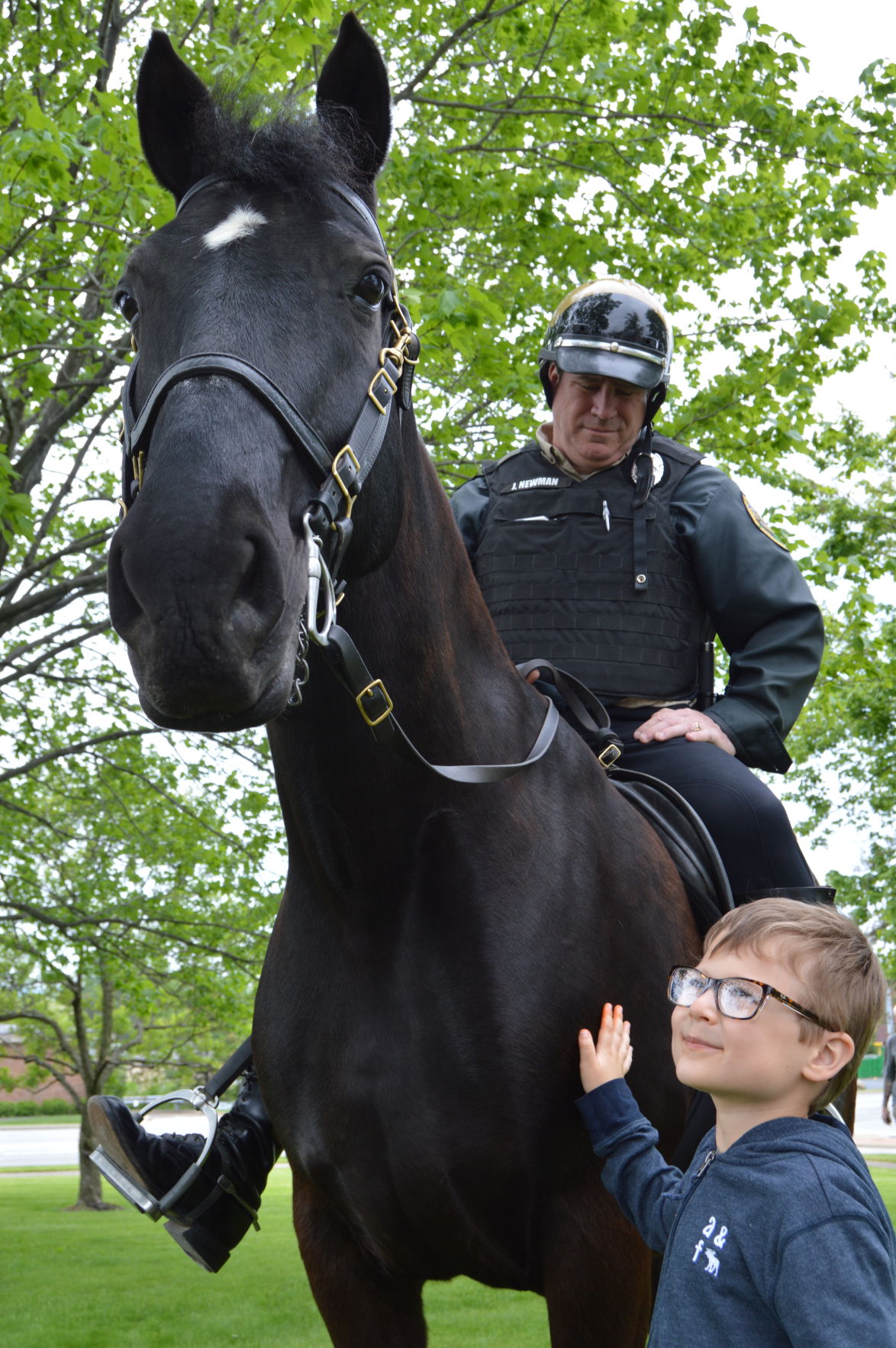 Nathan Helmet, 5, whose grandparents live in North Royalton, admires Onyx, a Cleveland Metroparks Ranger Unit horse, ridden by Ranger Jim Newman. Photo by JAIME ANTON