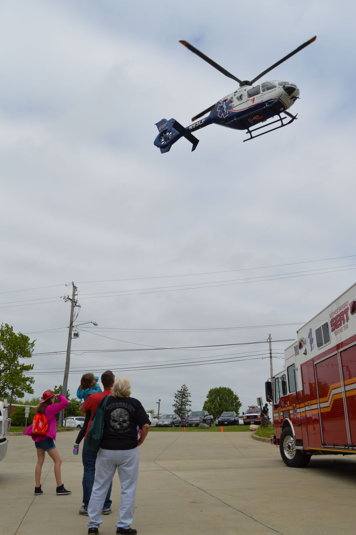 A family watches in awe as the University Hospitals MedEvac helicopter comes in for a landing in the old city hall parking lot. Photo by JAIME ANTON