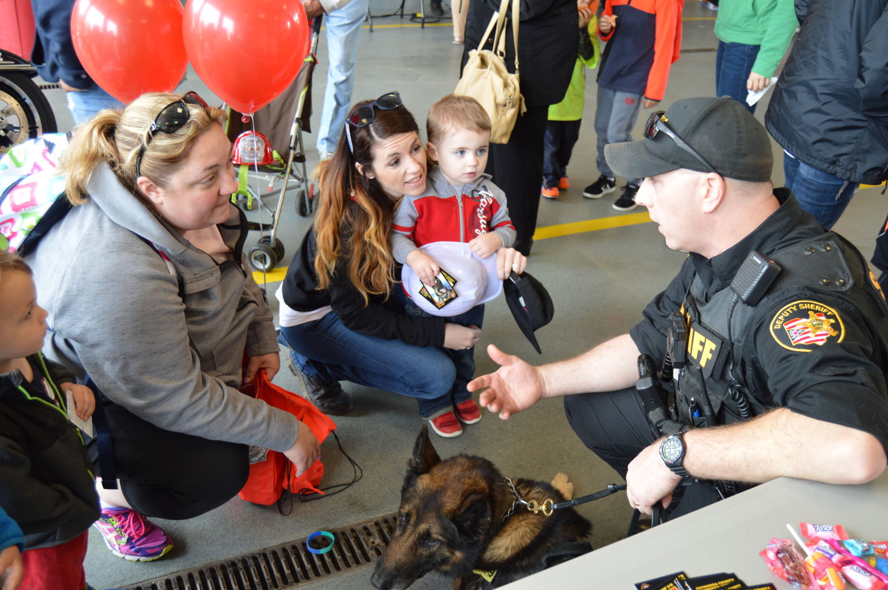 Nick Speina, 3, and his mom Amy, both of Brunswick, and Katie Kirksey and her son Lincoln, 2, both of Strongsville, listen in as County Sheriff Officer Nick Riegelmayer tells them all about Jax, the department’s K-9 officer. Photo by JAIME ANTON