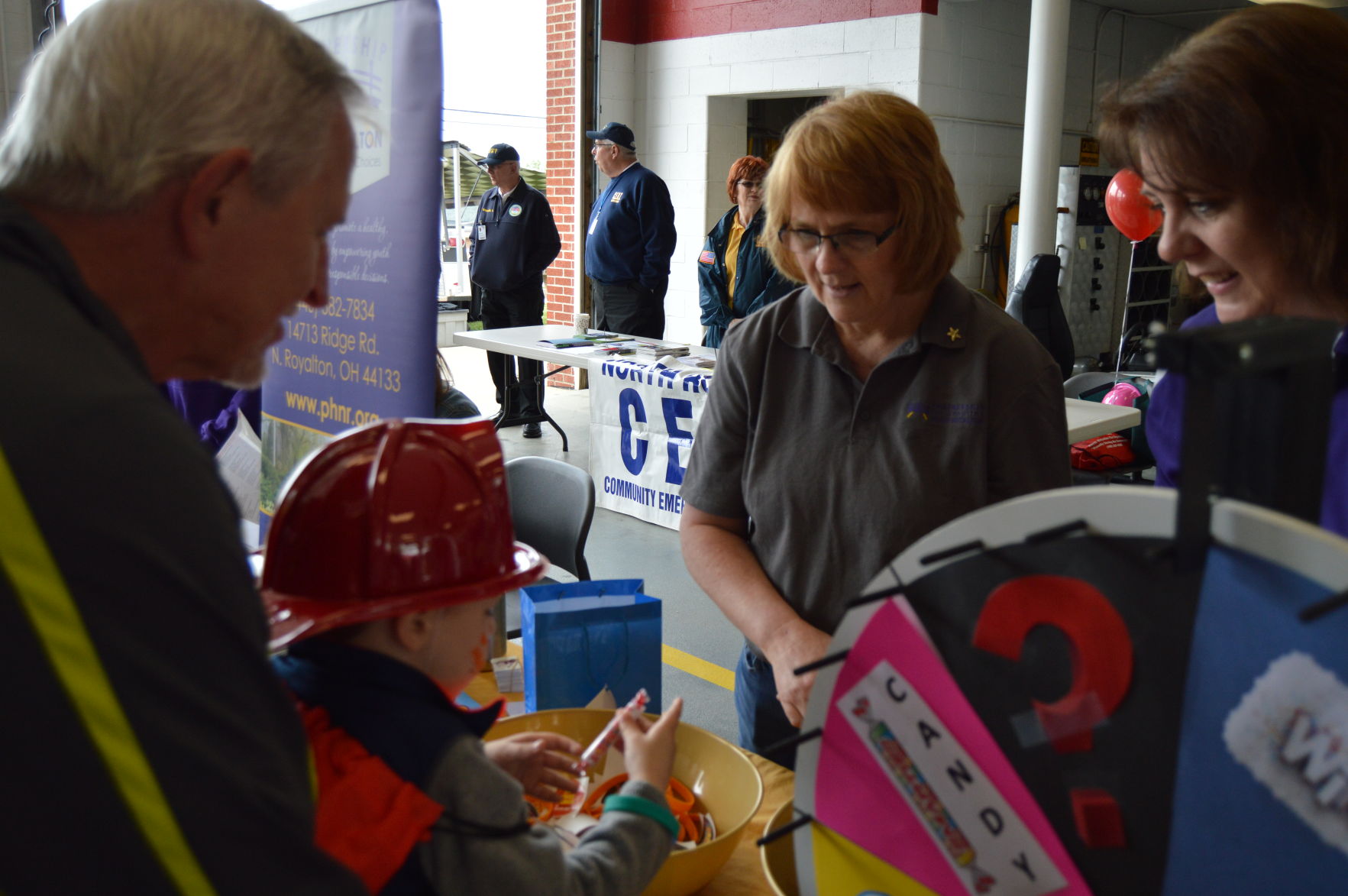 School board members Anne Reinkober and Jackie Arendt watch as Evan Ross, 2, of Hinckley, picks out a prize at the Partnership for a Healthy North Royalton booth. Evan gets a boost from his papa Bill Skowronski, of North Royalton. Photo by JAIME ANTON