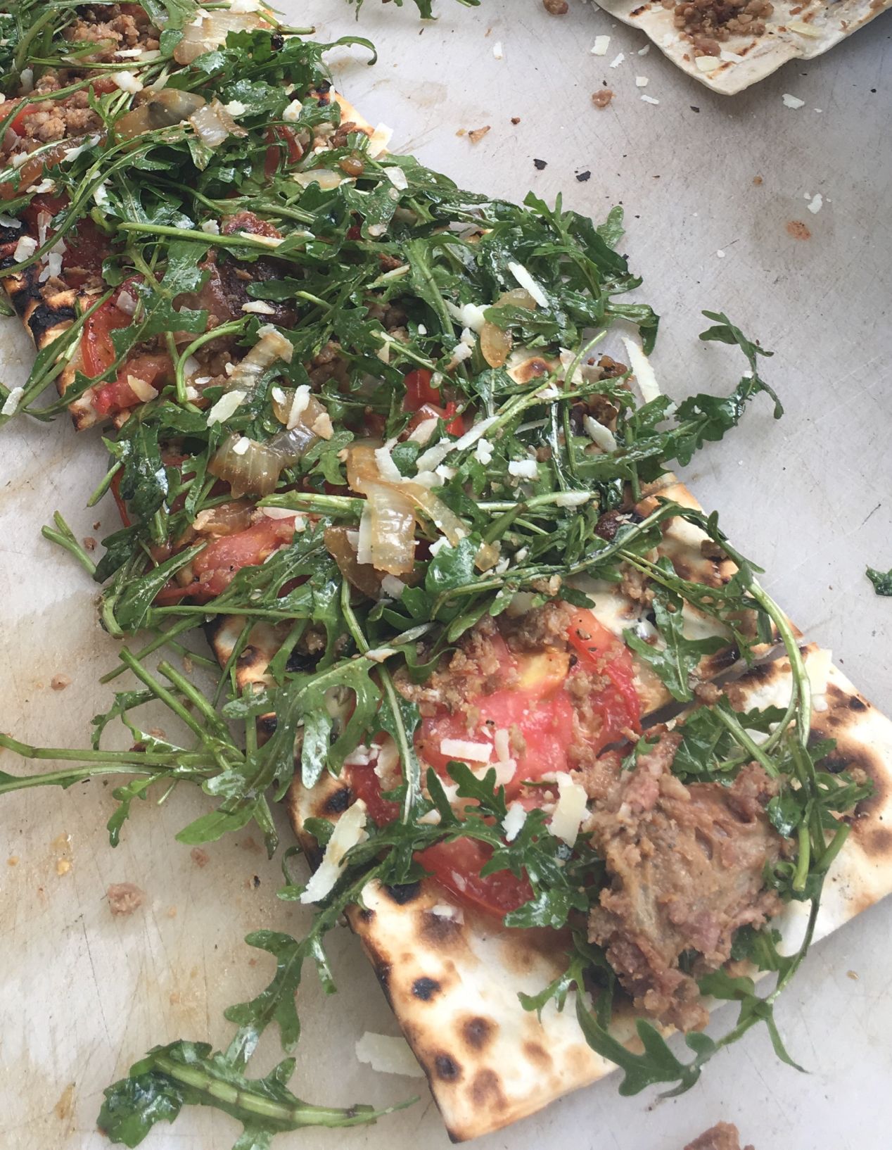 The ingredients are basic, but also key. Buy them fresh and local. Here is what they used: Flatbread (from Corkscrew Saloon), onions, garlic, tomatoes and arugula, several sausages (chorizo, mild Italian and a pizza-flavored sausage), olive oil and aged balsamic vinegar and a great cheese like a Pecorino Romano (or Yellow House Cheeseās Styx Mountain).