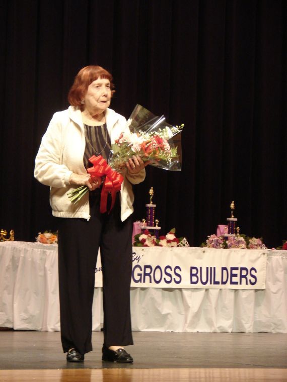 Sylvia Jensen stands before a crowd on its feet erupting in applause after announcing during the 2014 Miss North Royalton Community Festival Pageant that she would no longer be directing the pageant after 46 years at the helm. Jensen died May 13. File photo by JAIME ANTON
